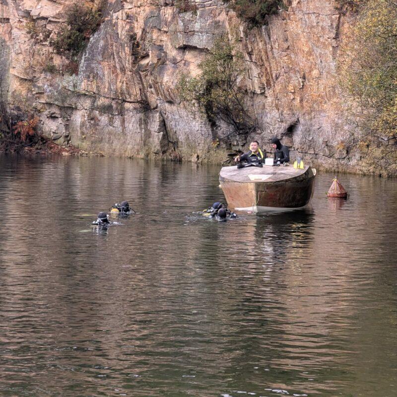 Si la mise à l’eau s’est passée de manière plus facile que prévue, son immersion a demandé quelques efforts de la part de nos plongeurs… Il a fallu lester un peu la bête, et malgré l’affolement des ordinateurs, certains ont dû aller chercher quelques pierres au fond de la carrière pour lester la bête. Au moins, malgré l’allègement que le navire a subi avant son immersion (retrait de quelques remorques de polystyrène) on sait désormais qu’il ne risquait pas l’immersion accidentelle !